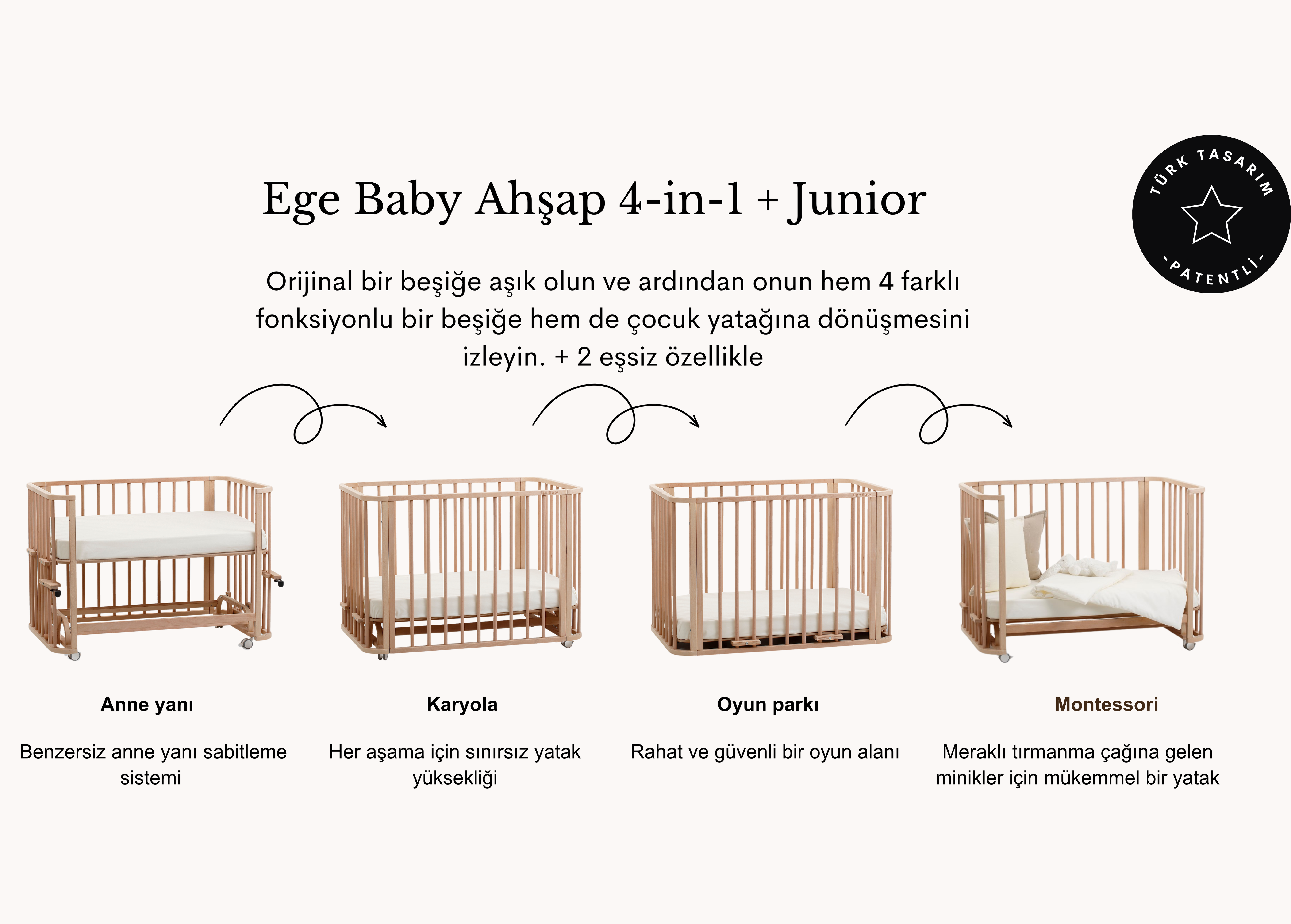 Ahşap 4 in 1 Beşik + Junior (Beşik + Uyku S. + Yatak)