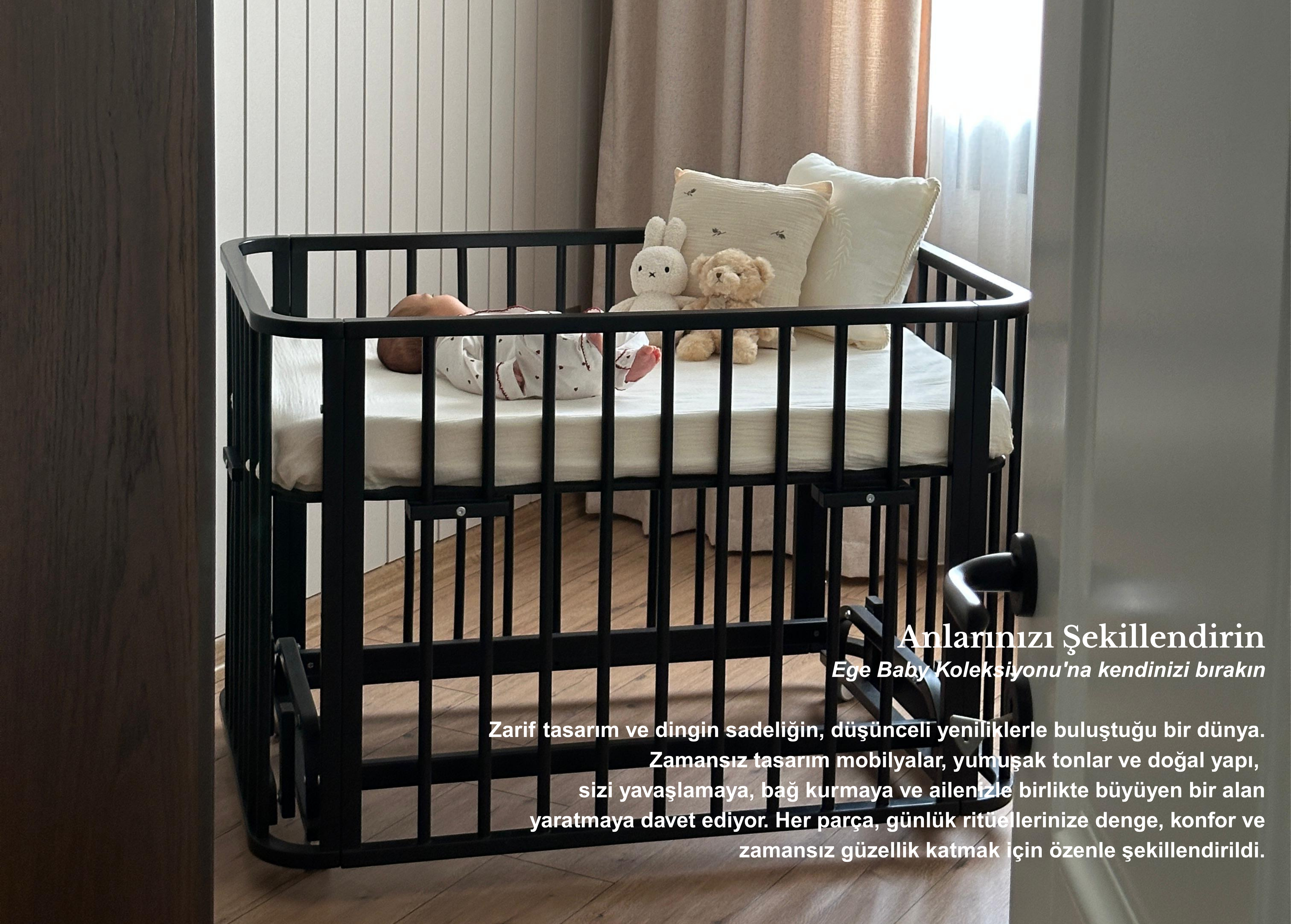 Siyah Ahşap 4 in 1 Beşik Takım 70 x 110 - anne yanı, karyola, oyun parkı, montessori + junior yatak - açık bej